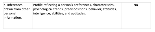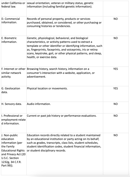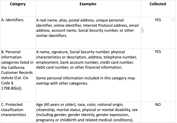 - Category B: California Customer Records personal information categories.